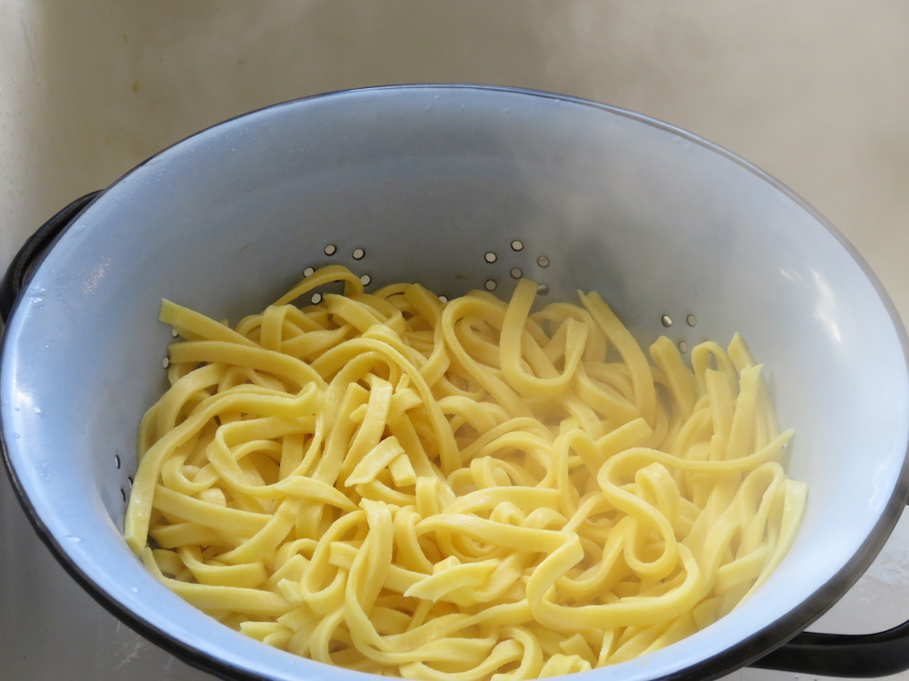 Die Nudeln können nun entweder zum Trocknen aufgehängt und eingelagert oder ins kochende Wasser gegeben werden. Wer ambitioniert und gerne kocht, es gewohnt ist 1-2 Stunden am Tag in der Küche zu stehen, wird sich sehr schnell an die Benutzung der Chitarra gewöhnen wette ich.