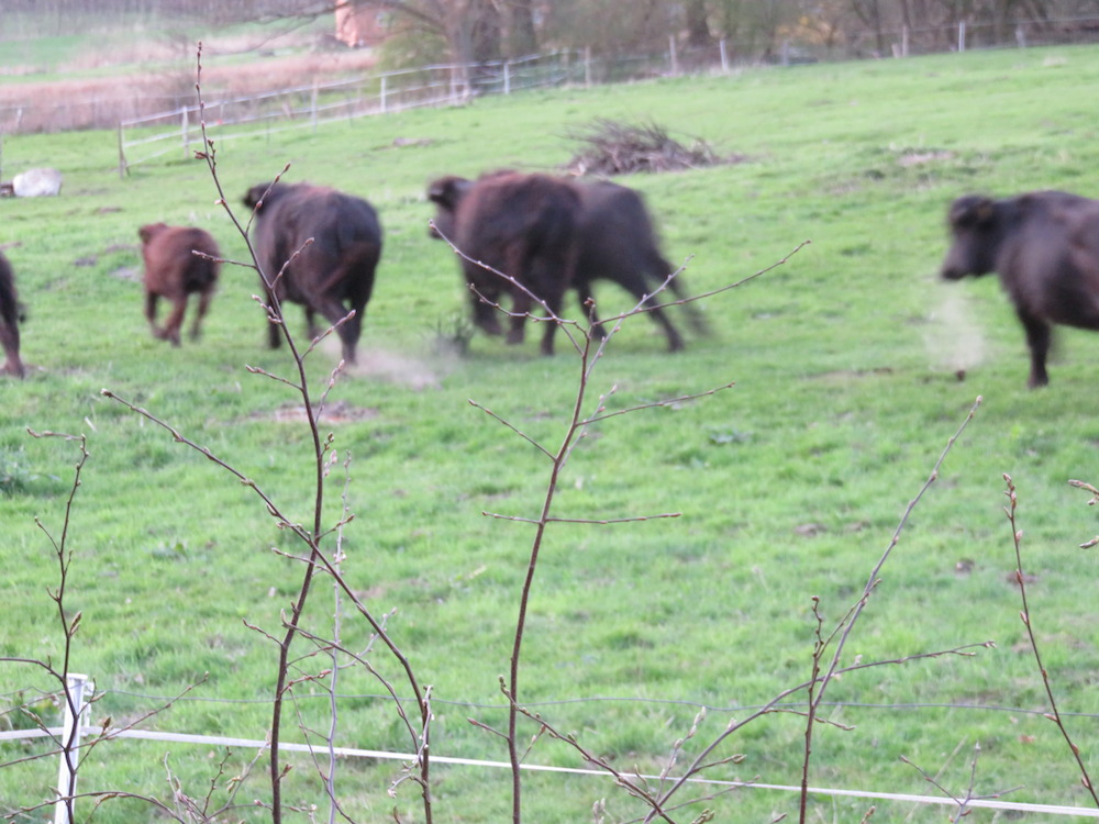 Im letzten Jahr ergaben sich einige Dinge die dazu führten, dass anstatt der Pferde auf der Nachbarkoppel Wasserbüffel einzogen. Anscheinend sind sie in Deutschland auf dem Vormarsch, wir hatten sie bislang nur in Tierparks gesehen und staunten also erstmal nicht schlecht. Schnell stellte sich heraus, dass sie angenehmere Nachbarn sind als Pferde (was zum teil auch daran liegen mag, dass sie einen tollen neuen Stromzaun haben und daher unsere Erlen- und Hainbuchen nicht auffressen). Kein hysterisches Gewieher, kein rasendes Galopp 5 Meter von meinem Schlafzimmer entfernt, sodass die Erde bebt – nein, wenn sie in ‚Stampede‘ die Koppel hinunter rasen, um unten im Sumpf ihre Ruhe zu haben, sieht es trotzdem gemächlich aus. Und meinem Empfinden nach bebt die Erde auch nicht so stark, aber vielleicht bin ich voreingenommen. Büffel sind tolle Nachbarn!IMG_8920