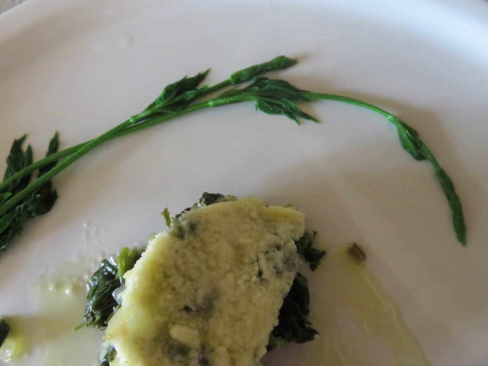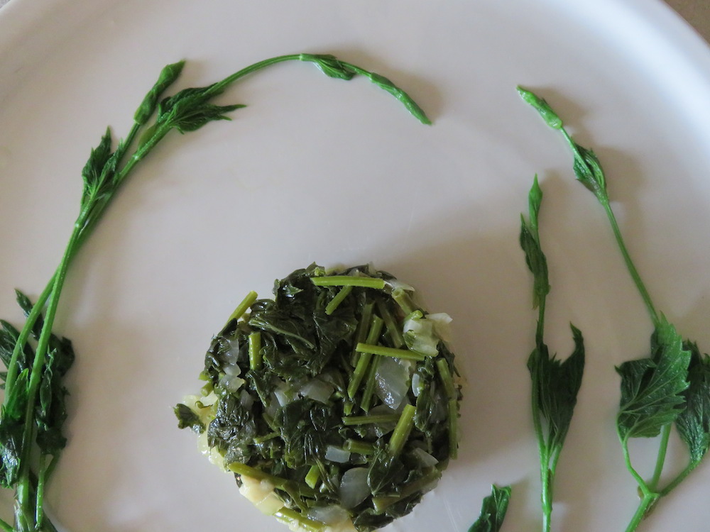 Ich habe die obersten Triebspitzen des Hopfens blanchiert und zum Garnieren (und natürlich Essen) benutzt. Die Blätter und leider auch einige dickere Stängel habe ich mit Zwiebeln in Olivenöl angebraten, in feuerfeste Förmchen gefüllt und mit einer etwa 0,5 cm starken Schicht aus fein geriebenem Pecorino bedeckt. Bei 200°C wurde das Wildgemüse dann im Ofen gebacken, bis der Käse sich gut verbunden hat. Kurz etwas abkühlen lassen, auf den Teller stürzen und das Luxusgemüse geniessen. Ich denke, insbesondere die Hopfenblätter werde ich versuchen, öfter in der Küche zu benutzen.