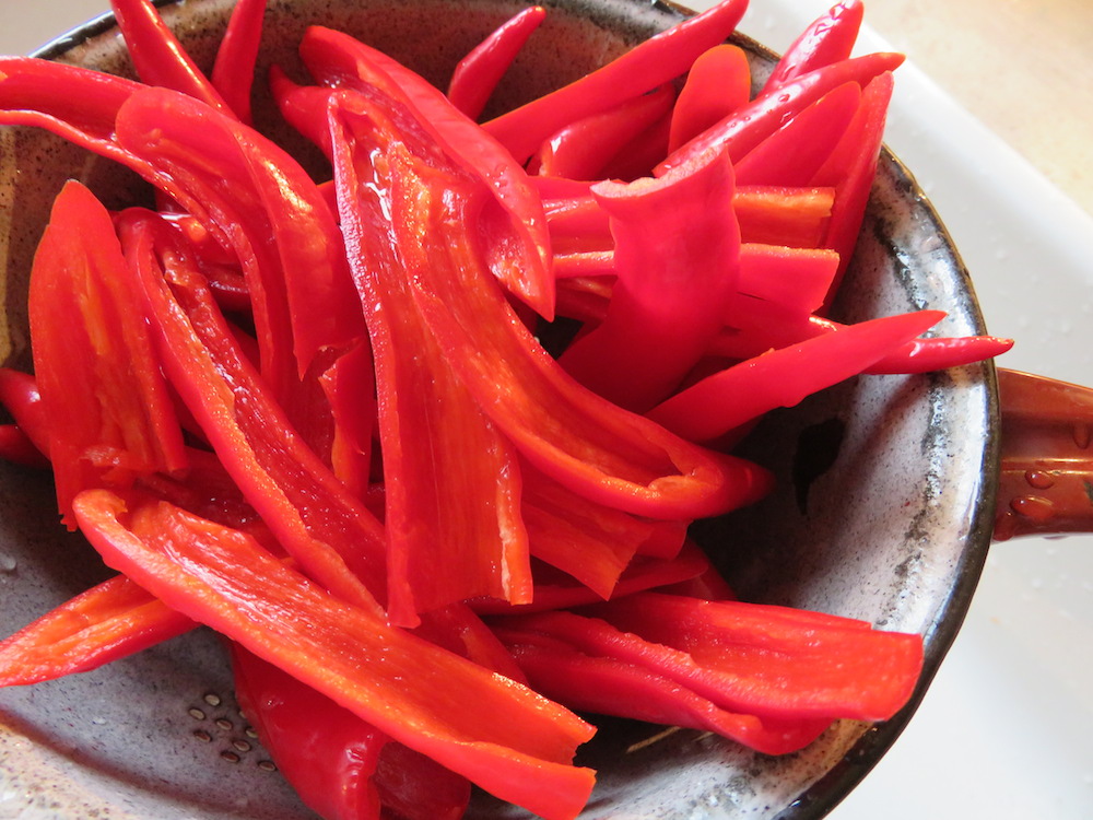 • 250 g Chilis ohne Samen und Häute (ich habe keine Ahnung welche Sorte das ist, sie sind schon süßlich-aromatisch aber eben auch recht scharf)