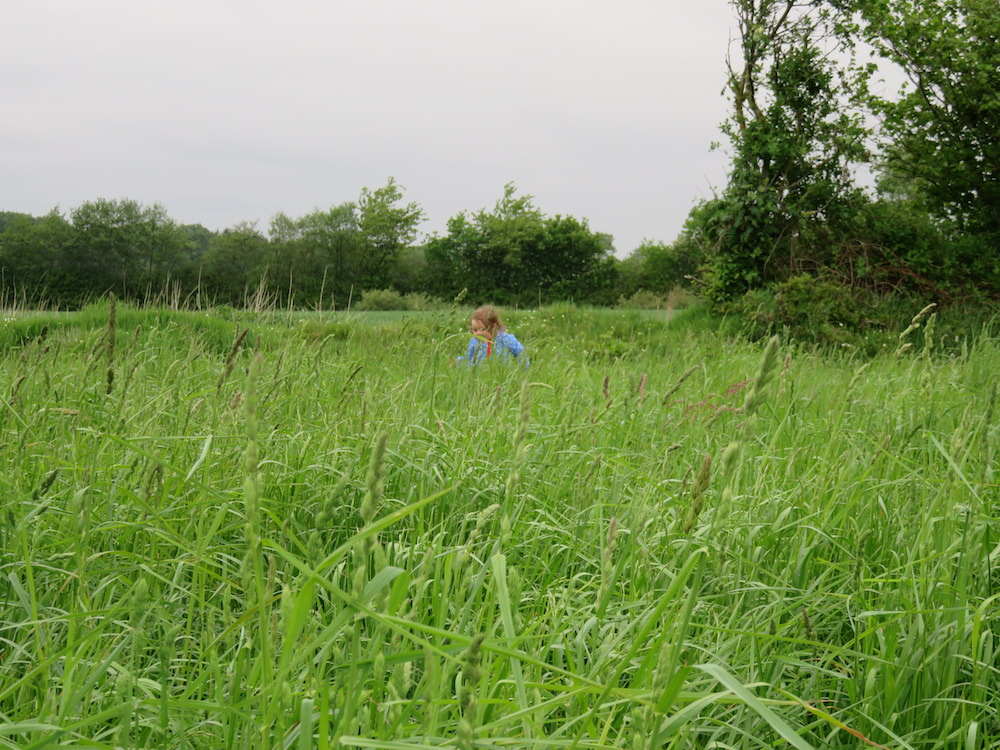 Die alternativen ’sicheren Orte‘ ringsum sind Wiesen von konventionellen Bauern, die mit einer Monokultur von Atomgras eingesät sind. Blaugrün schimmern sie, sind für Wild ziemlich unattraktiv und wachsen so dicht, dass es schwierig ist, dort zu laufen. Mit kleinen Kindern Atomgraswiesen nach Kitzen abzusuchen, brächte also ohnehin nicht viel weil sie nicht vorankommen und den Spaß verlieren.
