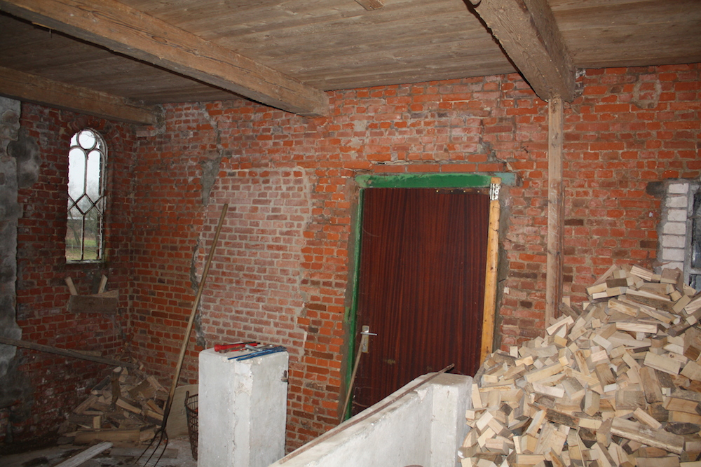 Das Holzlager der Vorbesitzer. Man achte auf die Abfangung der Balken. Irgendjemand, der mir NICHT glaubt, dass etliche Handwerker diesen Raum nicht betreten wollten?