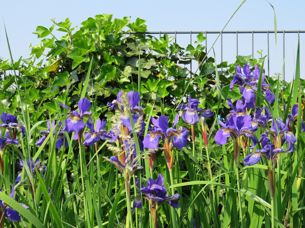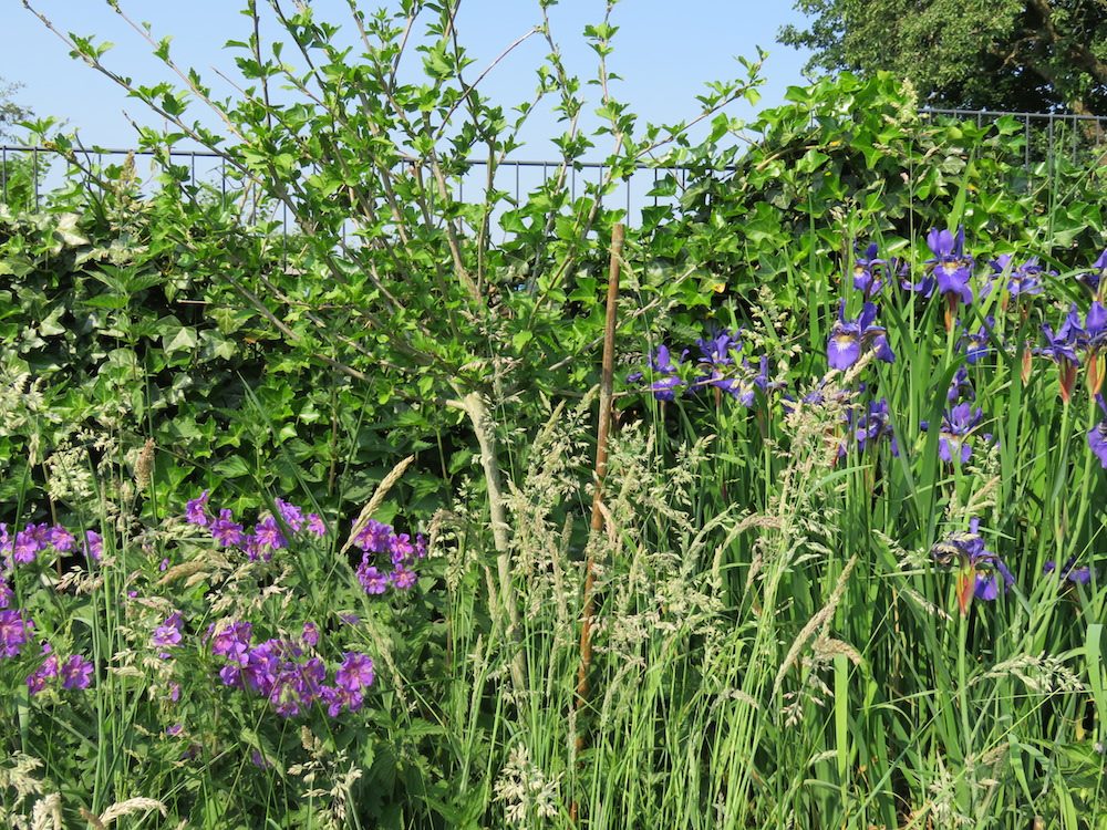 Schwertlilien, Storchschnabel und Hibiskus vor der Efeuwand. Der Zaun wurde direkt 2011 mit Efeu bepflanzt, erst jetzt ist es ziemlich dicht bewachsen.