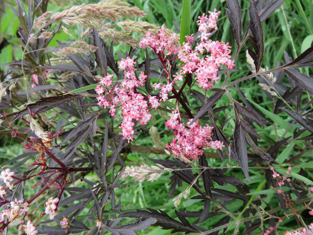 ‚Black Lace‘ Holunder mit schwarzen, gefiederten Blättern und rosa Blütendolden