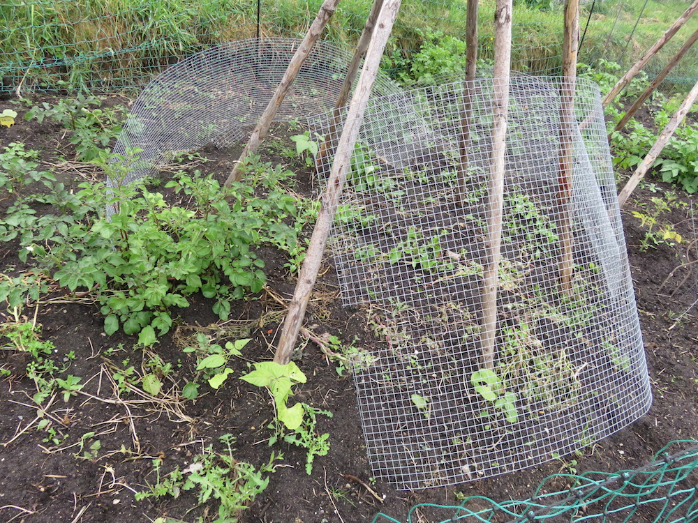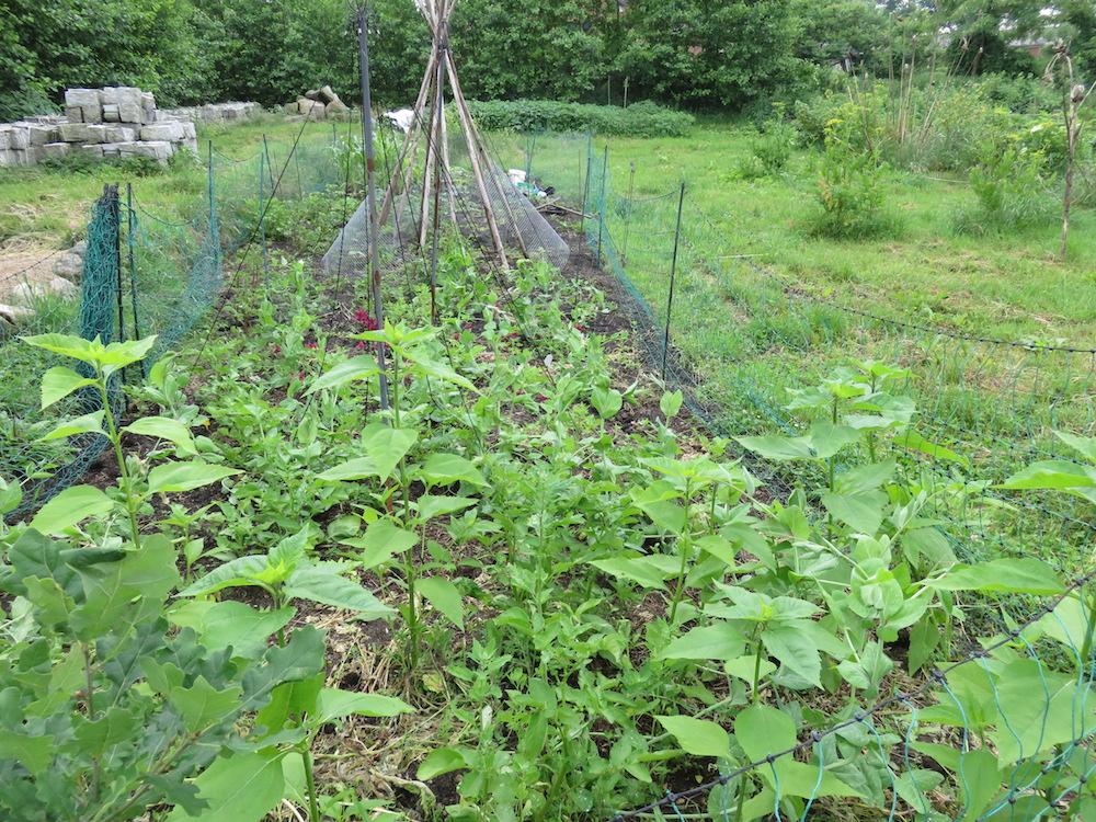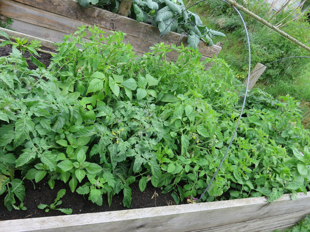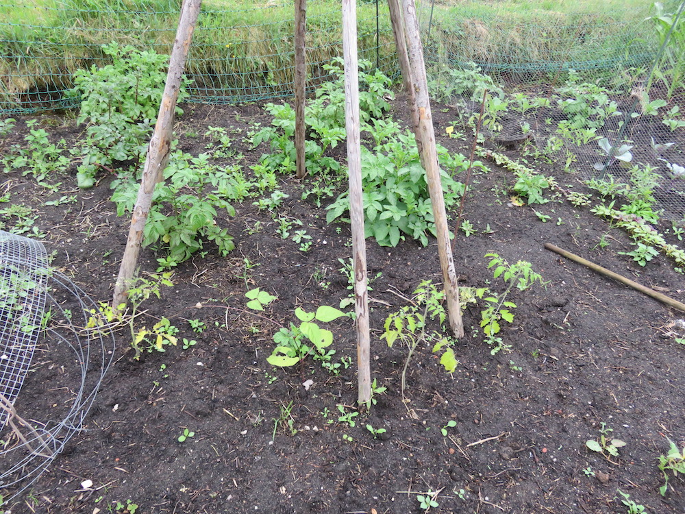 Überall kommen vergessene Kartoffeln hoch. Anstatt Stangenbohnen wachsen nun Wildtomaten am Tipi – allerdings merkt man ihnen deutlich an, dass ich die Setzlinge dieses Jahr vernachlässigt habe.
