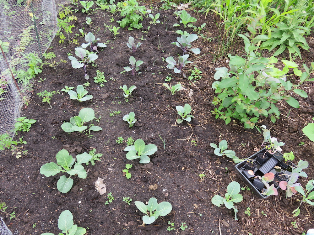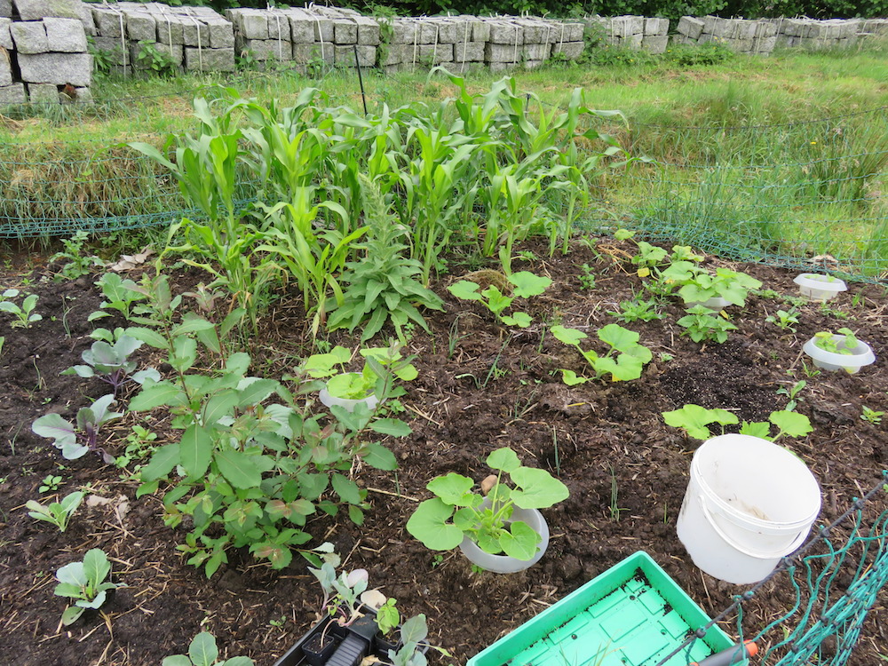 Der Übergang vom Landgewinnungsbeet zum Testbeet No III? Dort haben wir für Lebensmittel zugelassene Pappen auf den feuchten mit Wollgras bewachsenen Boden gelegt und abgelagerten Pferdemist draufgetan. Dort hinein Mais und Kürbisse angepflanzt. Im Bild das Landgewinnungsbeet mit Rotkohl, Weißkohl, Wirsingkohl (und eine Reihe nicht aufgegangene Reiserbohnen ‚Vermont Yellow Eye‘ von Deaflora.