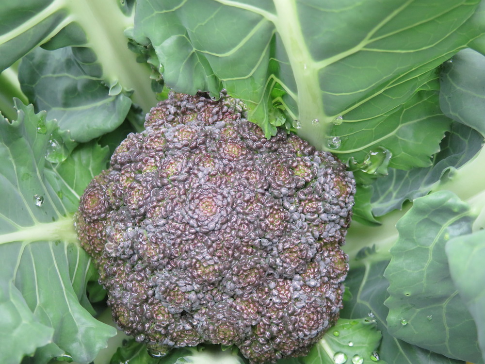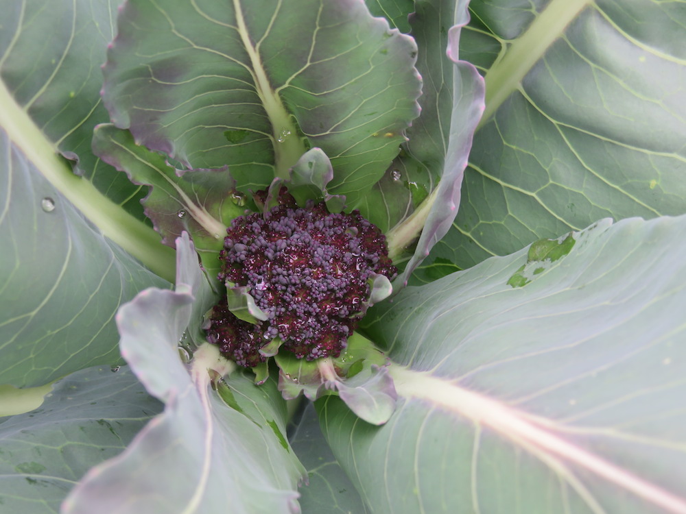 Der Broccoli ist ‚Rosalind‘ und sieht von der Farbe her bei mir immer so aus wie der kleine, der grössere, der mehr ins braune geht ist wirklich extravagant. Auch von der Form finde ich. Romanesco habe ich dieses Jahr gar nicht. Weiss gar nicht warum – doch! Da habe ich letztes Jahr eine Kompanie Schnecken rausgeholt und keiner wollte ihn mehr essen.