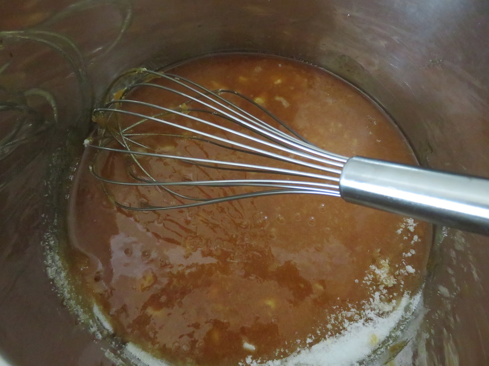 Nicht ohne vorher zu überlegen, wo ich eine solche Sauce schonmal gesehen hatte, nämlich hier. Ich orientierte mich an der Vorgehensweise, nämlich den Zucker zu karamellisieren und ein wenig an den Zutaten. Paprika wollte ich allerdings nicht extra kaufen wenn ich rote Chilis zuhause habe, also habe ich es folgendermassen gemacht.