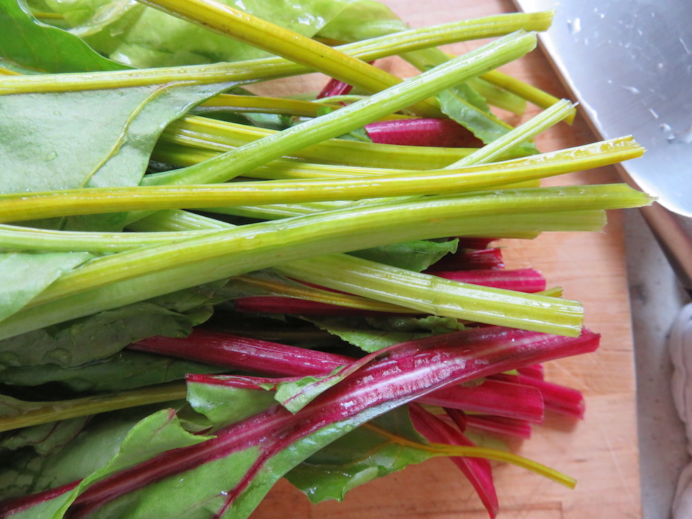 Dazu passt gut ein Schmorgemüse aus gelbe und rote Bete-Blättern. Dafür habe ich eine Handvoll gewürfelten Speck angebraten und die grob geschnittenen Bete-Blätter bald dazu gegeben.