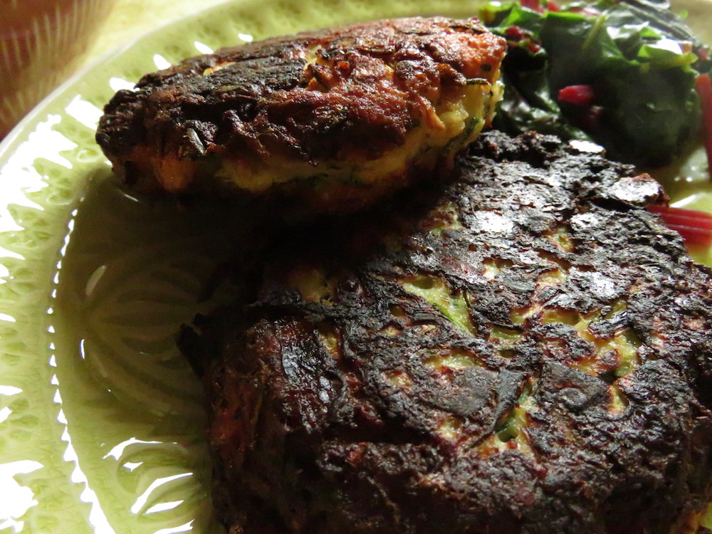 Den Käse zerbröseln und unter die nun trockenen Zucchini-Raspeln mischen, fein geschnittene Basilikumblätter und Schlotten ebenso, mit dem Mehl bestäuben, vermischen, Eier dazu, vermischen. Gut kneten und dabei am besten die Händchen benutzen, um ein Gefühl für die richtige Konsistenz zu bekommen. Soviel Paniermehl wie nötig zugeben.