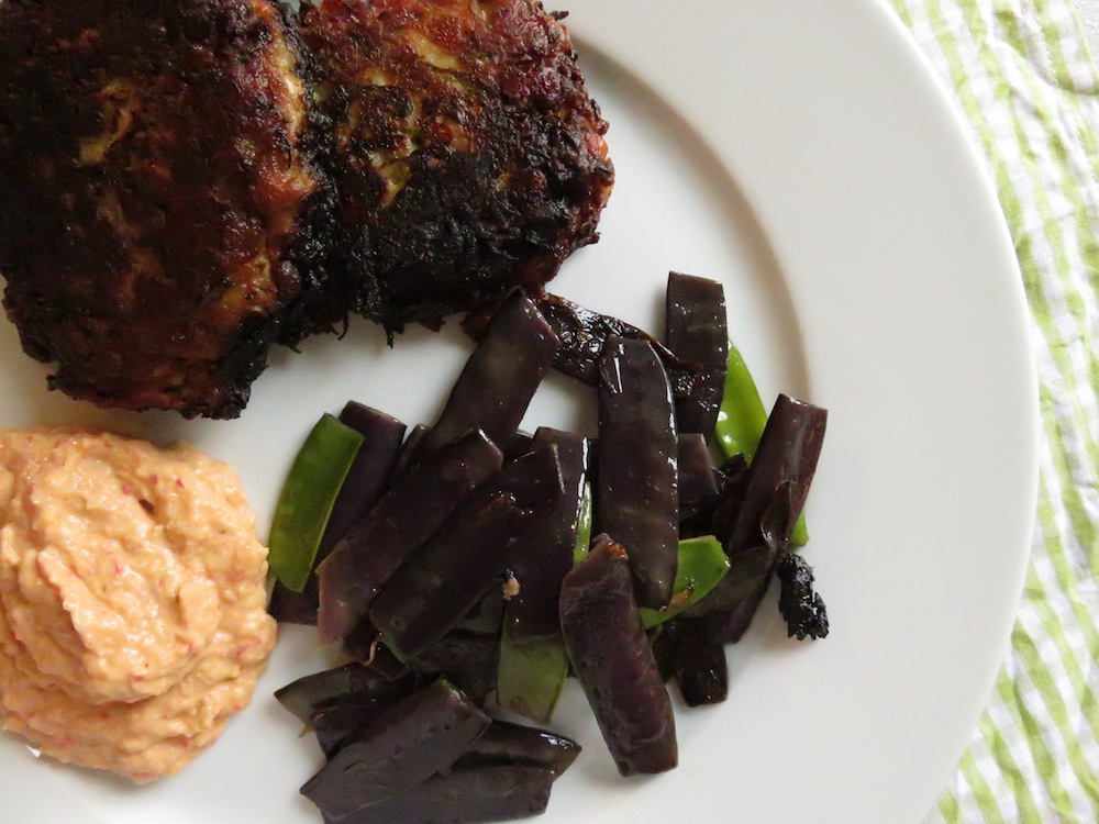 Die Zucchini-Puffer schmecken auch am nächsten Tag noch prima und können im Backofen erhitzt werden. Ich bin manchmal etwas mäkelig mit wieder erwärmtem Essen, die Bratlinge gehören aber definitiv zu den Dingen, die davon profitieren gut durchzuziehen und wieder erwärmt zu werden. Auch der Dip schmeckt am nächsten Tag natürlich noch intensiver. Ich habe an Tag 2 grüne und lila Zuckerschoten gedünstet und dazu gereicht. Auch diese Variante schmeckt sehr lecker sofern die Zuckerschoten wirklich jung und zart sind.