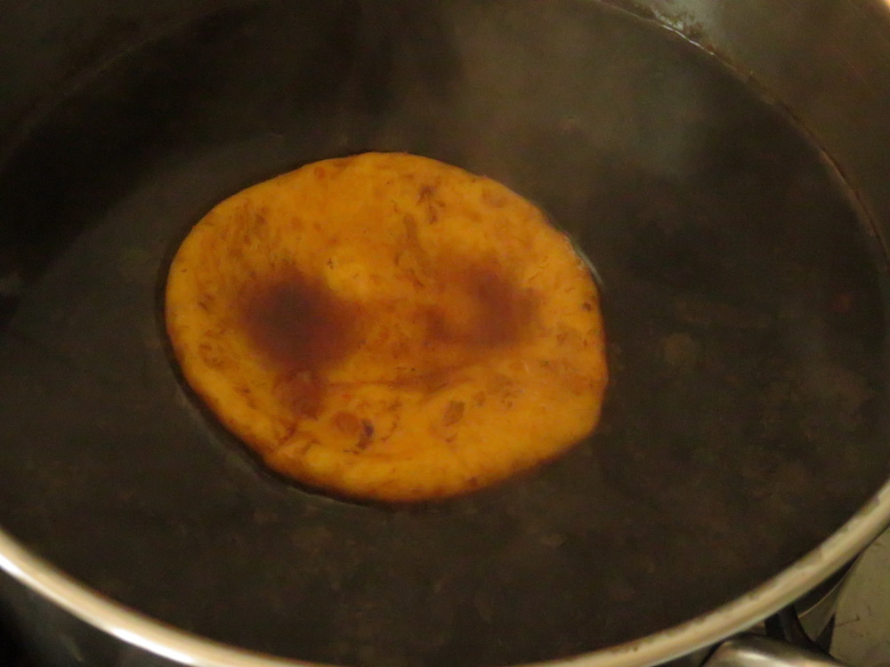 IMG_1236Bei Ginger&Bread heisst es, man solle die Sopaipillas bei 70°C für 2-3 Minuten frittieren, das funktioniert (bei mir) nicht. Ich brauche mindestens 120°C damit die Sopaipillas auch etwas im Öl brutzeln und sich nicht nur vollsaugen, aber das mag von Öl zu Öl unterschiedlich sein. Dann kommt es auch in etwa mit den 2-3 Minuten Garzeit pro Seite hin, aber nach dem ersten Testen hat man ohnehin den Dreh raus, wie die Sopaipillas aussehen müssen, damit sie fertig sind.