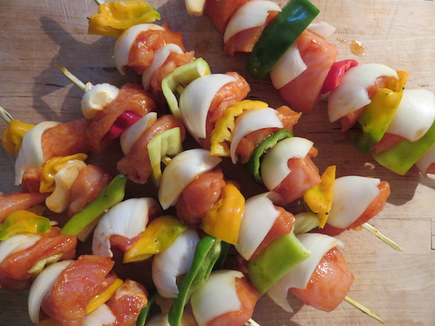 Published 22. September 2016 at 620 × 465 in Hühner-Schaschlik mit gebackenen Kartoffelspalten, buntem Mais & Wildtomaten-Rucola-Salat: Alles aus dem Garten.