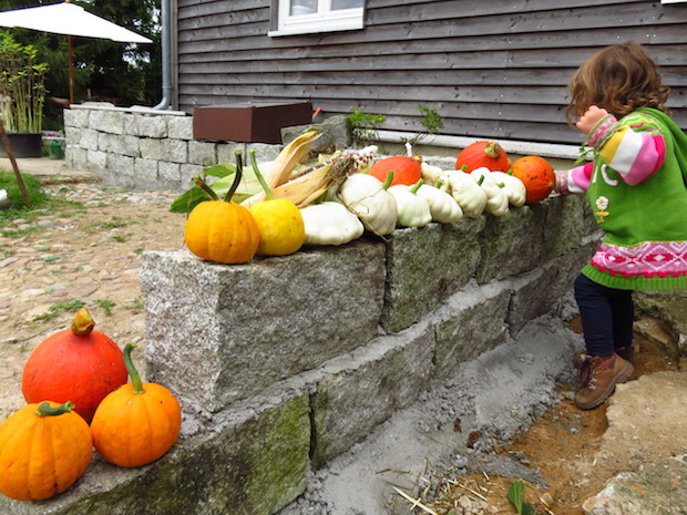 Die ersten Kürbisse sind geerntet: ‚Jack be little‘, Patissons und Hokkaidos sitzen auf der frisch errichteten Trennmauer