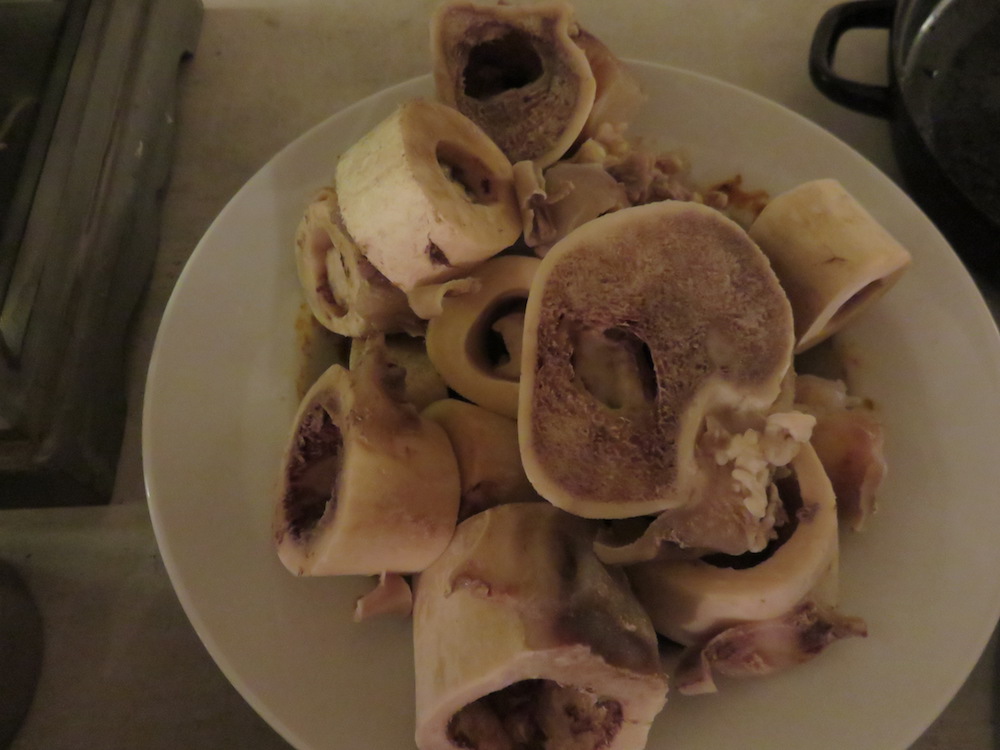 Mein „Geheimnis“ bei Fleisch sind z.B. viel Knochenbrühe und wenig und kleingeschnittenes „günstiges“ Fleisch. Die sog. „Sandknochen“ von Weiderindern gibt es hier für ca. 1 €/kg. Die Sandknochen der White Galloways, die hier ein Nachbar hält, kann ich mindestens 3 x auskochen jw. 3 kg mit 5 l Wasser und Suppengemüse. Heraus kommt pro Kochvorgang so 2,5 bis 3 l Brühe. Und das mal drei. Ein viertes Mal geht auch noch, aber das ist dann für den Hund. Die Brühe wird eingeweckt und dient dann im Winter als Suppengrundlage (mitunter verdünnt mit Wasser) und ich koche – ebf. mit Wasser verdünnt, Reis und Nudeln damit. Aus allen anderen Knochen, die so anfallen, z.B. von Freiland Hähnchen, Hühnern, Schwein koche ich auch Knochenbrühe. Und zwar so viel, dass es über den Winter für mich reicht, d.h. für eine Person mind. 1 l Brühe/Woche = 26 l. Mindestens!