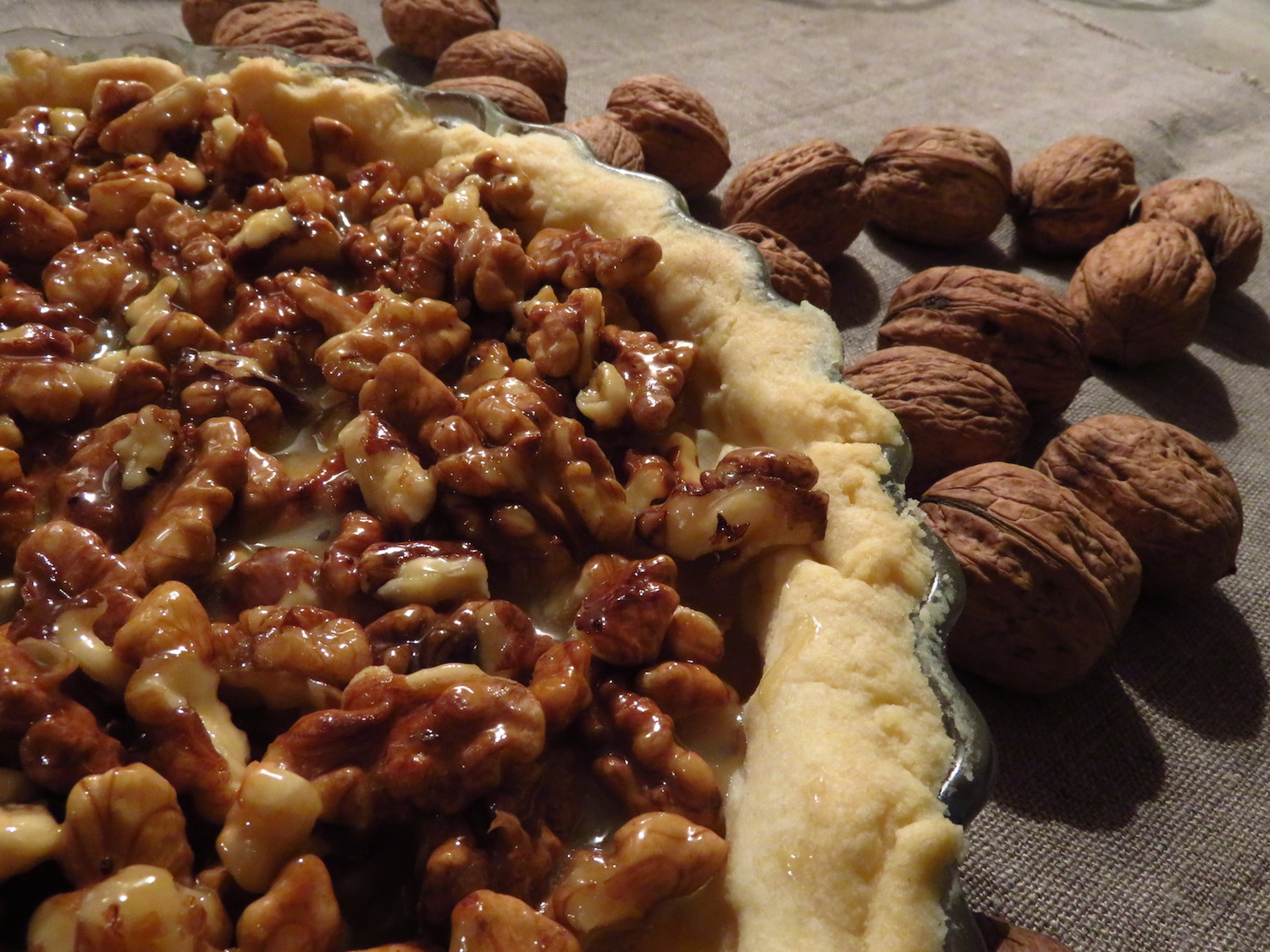 Zwischen den Jahren habe ich eine ausserordentlich deliziöse Walnuß-Tarte gemacht, die die komplette versammelte Sippe überzeugt hat. Daher muss das Rezept hier unbedingt (auf deutsch) vermerkt und ihr davon in Kenntnis gesetzt werden, dass ihr diese Tarte keinesfalls unprobiert lassen solltet. Das Ausgangsrezept stammt von Mamangerie, ich habe im Wesentlichen die Mengen sowie ein wenig das Vorgehen und die Zutaten geändert und würde beim nächsten Mal vielleicht einen etwas anderen Teig probieren. Dieser war mir ein wenig zu dröge – aber vielleicht reicht es auch, je nach Ofen, die Backzeit etwas anzupassen.