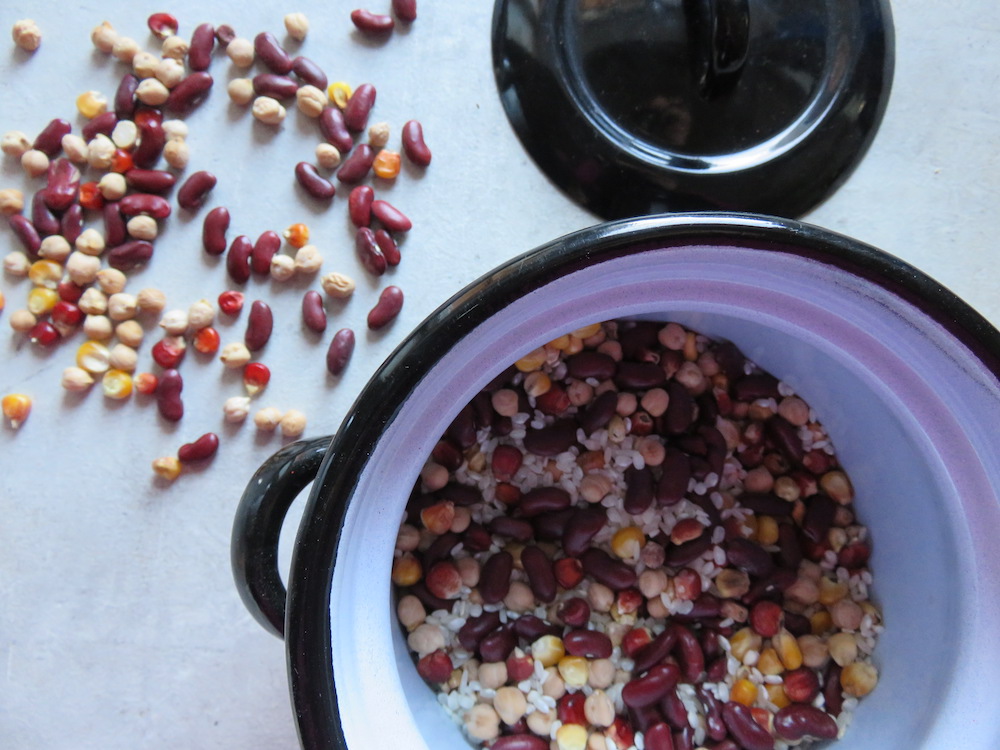 Und wenn man die Öfen schon laufen hat, kann man sie mannigfaltig nutzen. Wo ich früher aus ästhetischen Gründen entsetzt abgewunken hätte, kenne ich heute gar nichts mehr und trockne Altbrot für die Kaninchen sowie Apfelringe für uns auf dem Specksteinofen, lasse meine Teige dort gehen und – jetzt neu – koche sogar das Hühnerfutter im Badezimmer. Aus jahrelang abgelaufenen Hülsenfrüchten, Getreide und Milchpulver aus der Speisekammer der Baumfrau werden alle 2 Tage schmackhafte und hoffentlich ausgewogene Hühnchen-Menues zusammengestellt und ich dokumentiere fleissig, bei welcher Nahrungszusammenstellung sie am besten legen. Auch zum schnellen und energieneutralen (wenn der Ofen eh läuft) Quellen von Hülsenfrüchten eignet sich dieser Ofen perfekt.