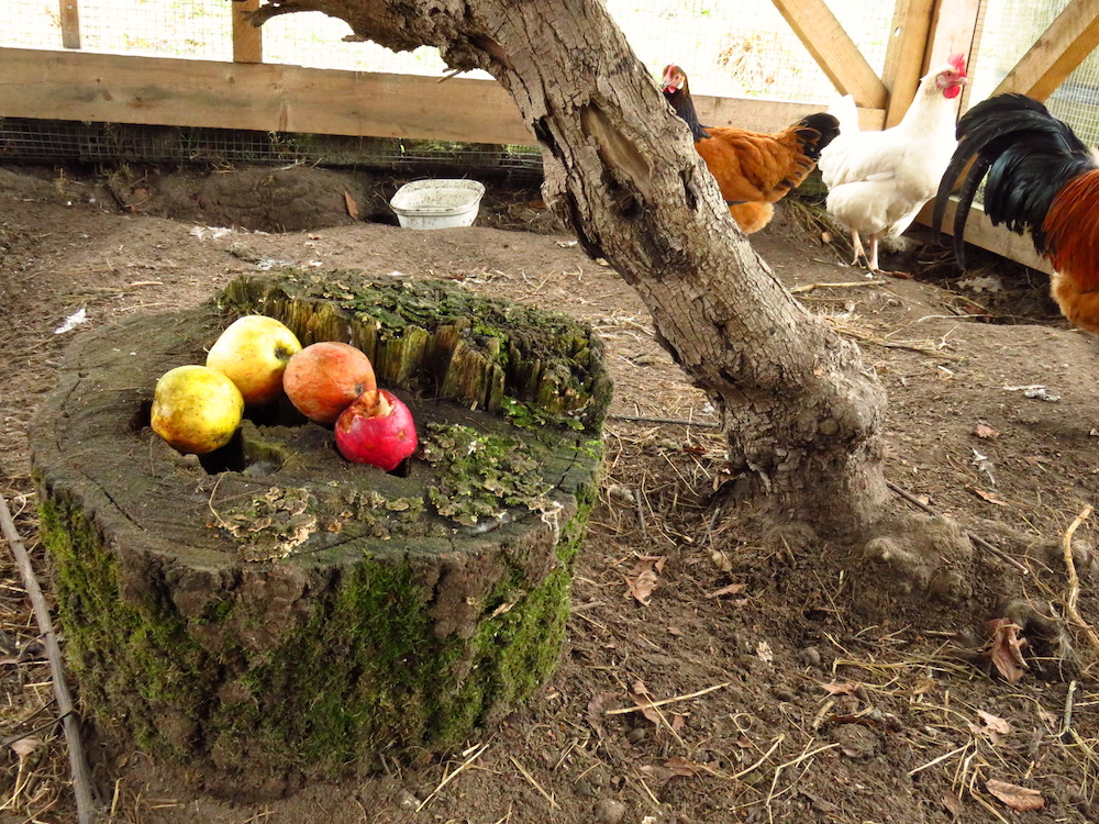 Komplette, ganze Äpfel werden nun auch genommen; ich muss sie bloß fachgerecht in den morschen Baumstumpf stecken, damit sie nicht wegkullern. Erwähnte ich bereits, dass die Mädels hoffnungslos verwöhnt sind?