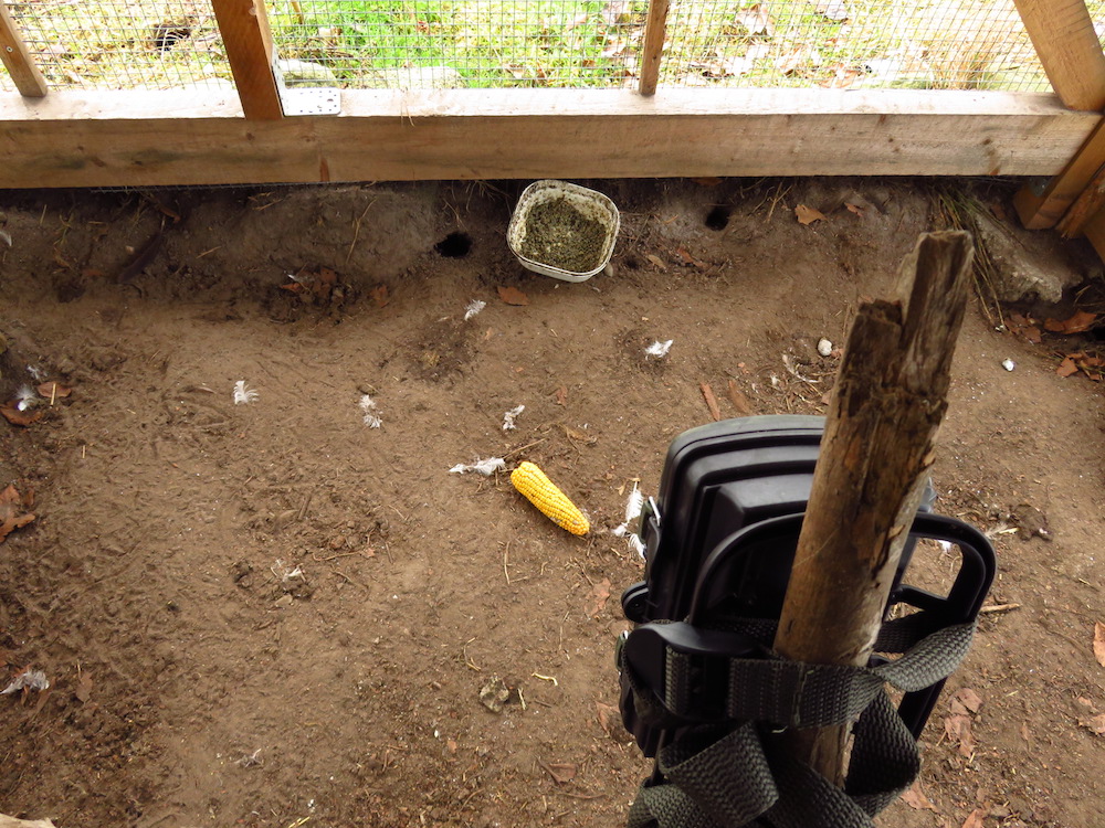 Nun wollte ich ernsthaft und am besten sofort wissen, was Nachts in der Voliere abgeht. Mit rechten Dingen konnte es ja nicht zugehen, dass jede Menge Rattenlöcher auftauchen aber kein einziges Modell von Rattenfalle mit verschiedenen Ködern fängig ist! Lückenlose Videoüberwachung der Lokalität war angezeigt und wurde prompt umgesetzt. Noch dazu gab es an strategisch günstiger Position Reste vom Legemehl sowie Maiskolben. Nichts.