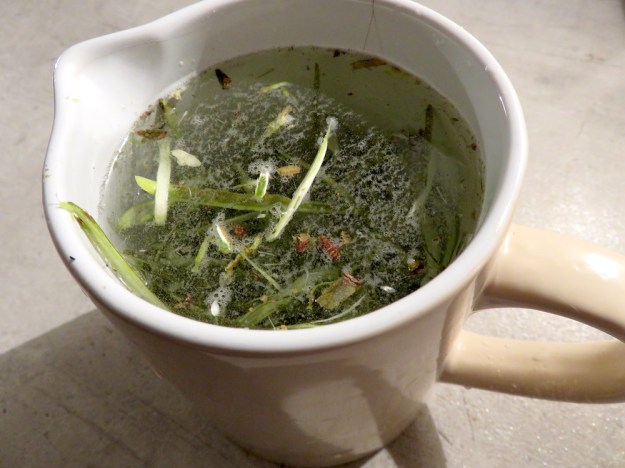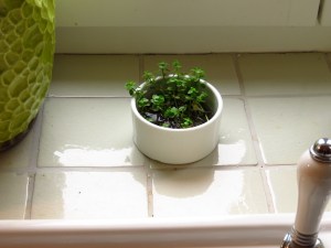 Ein weiterer Versuch betrifft diese schmucke Sumpfpflanze. Ich habe sie in einem fast ausgetrockneten Schlickloch an unserem Holzplatz gefunden und später auch in einem angrenzenden Wassergraben. Noch habe ich sie nicht bestimmt, aber ich meine mich erinnern zu können, vor einiger Zeit bei der Recherche von dieser Pflanze gelesen zu haben. Da ging es um die Produktion von großen Mengen Grünfutter (z.B. als Hühnerfutter) im Rahmen der hofeigenen Kreislaufwirtschaft. Leider haben Wasserlinsen, Entenflott und all‘ diese anspruchslosen und sich von Luft und Liebe ernährenden Pflanzen den grossen Nachteil, dass sie Radioaktivität wie einen Schwamm aufsaugen. Sozusagen. Meine Versuchspflanze lebt und wächst seit einigen Wochen auf der Fensterbank. Ein wenig Licht und klares Wasser bekommt sie und hat in der Zeit etwa das Doppelte an Grünmasse gebildet. Bislang habe ich leider nicht gewogen, aber man stelle sich nun vor, ich würde Hühnerkacke oder Karnickelkötel in das Wasser geben. Da müsste sie abgehen wie eine Rakete.