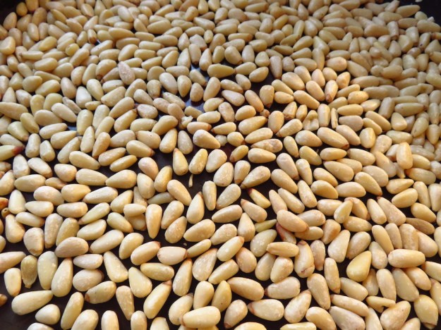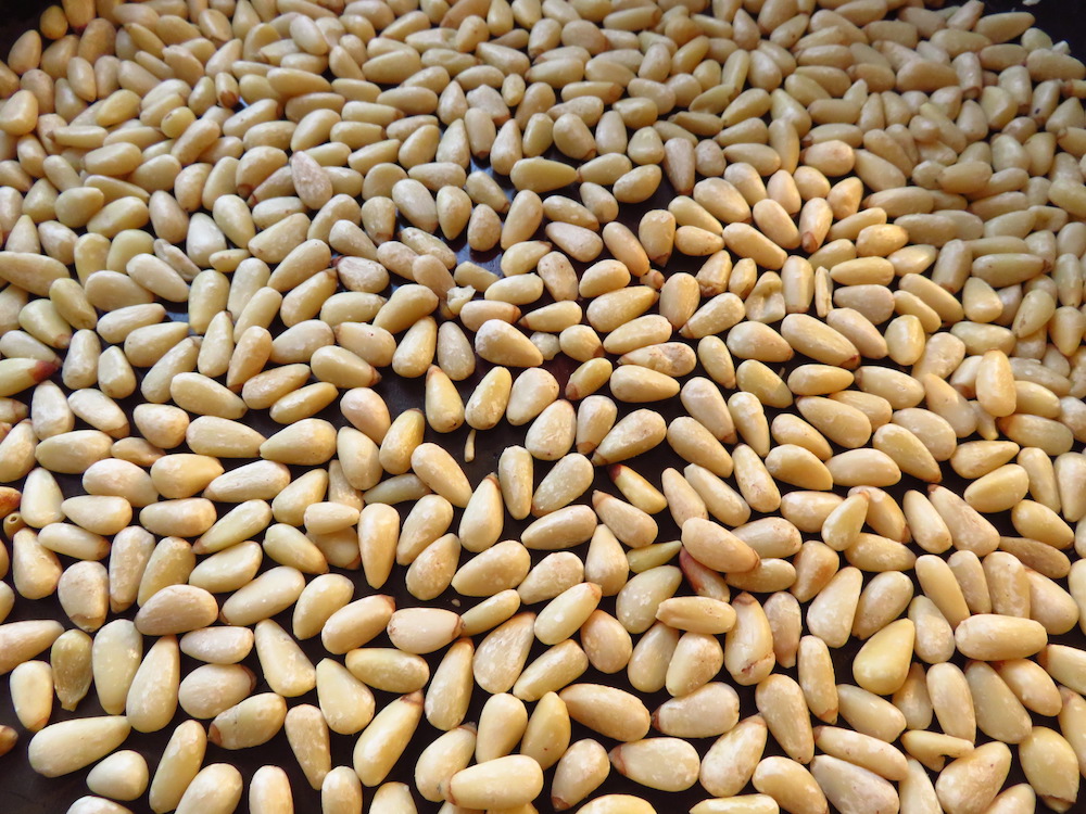 Die Pinienkerne in einer Pfanne bei leichter bis mittlerer Hitze leicht rösten. Die Kerne sollen ein duftiges, warmes Aroma entwicklen ohne Röstaromen, klar.