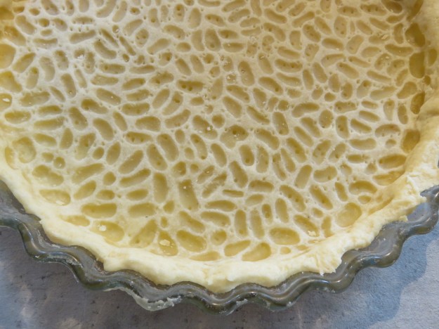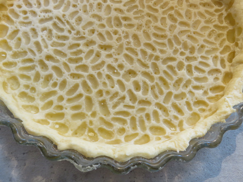 Mit einer Gabel mehrfach den Teig einstechen, mit Backgewichten, Hülsenfrüchten, V2A-Muttern oder sonstwas beschweren und mit Augenmaß für etwa 15 Minuten bei 180°C backen bis der Teig etwas bräunlich wird. Abkühlen lassen