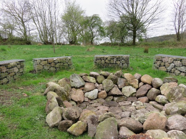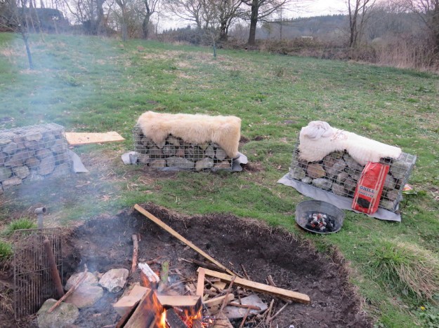 Um die Feuerstelle herum bauten wir Gabionen als Sitzbänke auf und ich füllte sie mit Feldsteinen, die ein benachbarter Bauer mal hier ablud. In diesem Zustand war die Feuerstelle schon recht komfortabel (vor allem, wenn man die Schaffelle auf die Gabionen legte und sich nicht das harte Metallgestänge in den Hintern piekt) und wurde gerne genutzt.