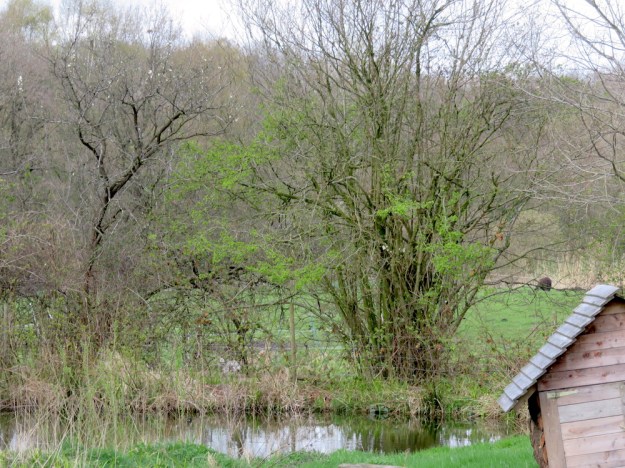 Die Stelle liegt mitten auf der Koppel mit Blick auf den Teich, in ausreichendem Abstand zu umliegenden Bäumen und der Boden ist dort nicht so nass, dass die Grube voll Wasser läuft. Man hat von dort fast das ganze Gelände gut im Blick und der Ort fühlt sich richtig an für eine Lagerfeuerstätte. Sind die Bäume erstmal groß und alt, wird es ein geschützter, verwunschener Ort sein.