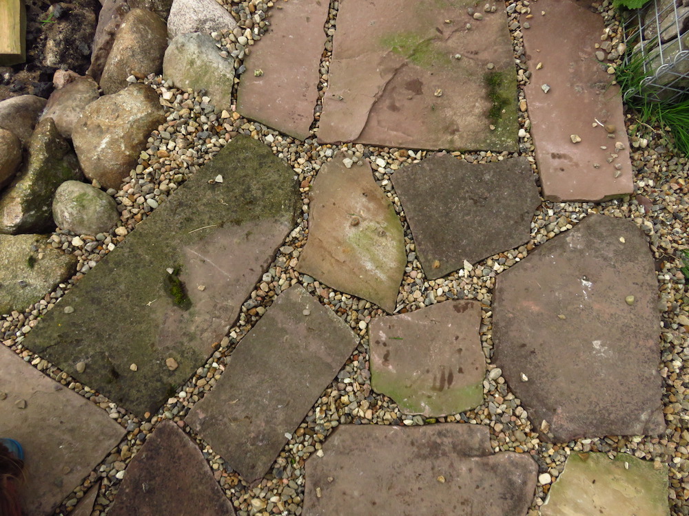 Und weil das Legen von Polygonal-Platten in der Theorie zwar ganz einfach ist, weil es mit an Sicherheit grenzender Wahrscheinlichkeit irgendwo das passende Stück gibt und man es nur finden muss – oder alternativ fachgerecht die Stücke zuschlagen kann – in der tückischen Praxis die Steine sich aber verstecken und auch noch verschieden hoch sind, haben wir direkt einen Fachmann rangelassen, der zufällig auf dem Hof wohnt. Der Gastarbeiter karrte Kieselsteine ran, die – ebenfalls zufällig – in ziemlich großer Menge noch neben dem Haus lagern und der Gatte legte die Platten passgenau, ohne Stolperfallen und schön rund in das Kiesbett.