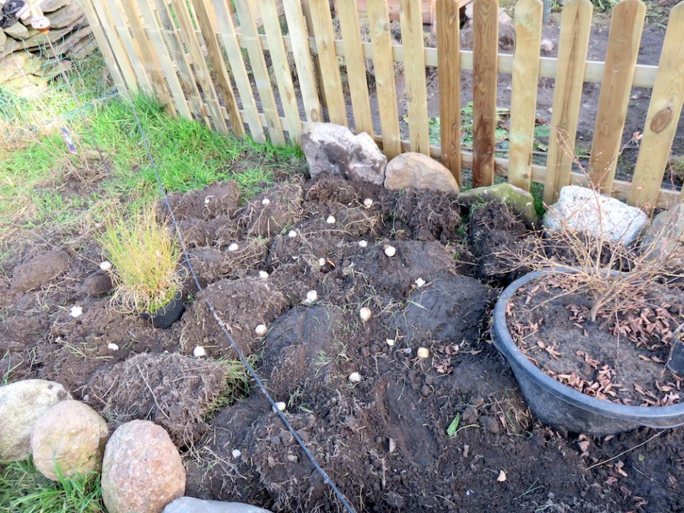 Grassoden umdrehen und Blumenzwiebeln platzieren