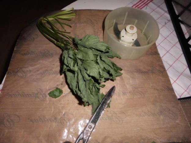 Wenn das Laub nach 3-4 Tagen „rascheltrocken“ ist, schneide ich es mit der Schere klein, zerkleinere es noch einmal in meiner uralten aber sehr brauchbaren Moulinette und trockne es dann noch ein paar Stunden im Dörrgerät nach. So braucht es weniger Platz im Dörrgerät und weniger Zeit und damit Strom zum Trocknen.