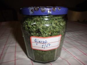 Abgefüllt in Twist-off Gläser wird es jetzt bis zum Winter dunkel und trocken gelagert. Im Winter streue ich vor dem Essen immer ca. 1 Teelöffel über Eintöpfe und Suppen, bevor ich sie esse. Das Kraut wird nicht mit gekocht, sondern nur über das Essen gestreut, damit es seine Vitamine behält. Der Geschmack von Giersch erinnert ein wenig an Petersilie, hält den Geschmack aber besser als getrocknete Petersilie.