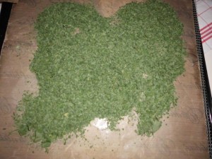 Wenn das Laub nach 3-4 Tagen „rascheltrocken“ ist, schneide ich es mit der Schere klein, zerkleinere es noch einmal in meiner uralten aber sehr brauchbaren Moulinette und trockne es dann noch ein paar Stunden im Dörrgerät nach. So braucht es weniger Platz im Dörrgerät und weniger Zeit und damit Strom zum Trocknen.