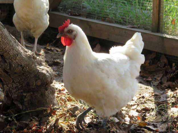 2 unserer Bresse-Hühner sind bei uns eingezogen: der einzige Hahn und eine Henne. Die restlichen beiden überlebenden Hennen glucken gerade auf dem Hof des Bekannten, wo auch die Bresse-Eier letztes Jahr bebrütet wurden. Die Henne hat ‚Augenringe‘ und erinnert mich dadurch natürlich an eines der Hühner aus Pettersson & Findus. Prillan? Henni?