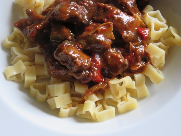 Ein weiteres Gericht aus der Selbstversorgerküche – und ziemlich gut geeignet für die derzeitige Herbststimmung, die hier seit etwa 2 Wochen Einzug gehalten hat. Nachts ist es kühl, morgens hält sich der Tau lange, das Gras scheint bereits langsamer zu wachsen und täglich gibt es stürmische Böen, Sonne und Starkregen im Wechsel. Herbstwetter also, zu warm zwar, um den Ofen anzuheizen aber ein deftiges Gulasch passt gerade perfekt.