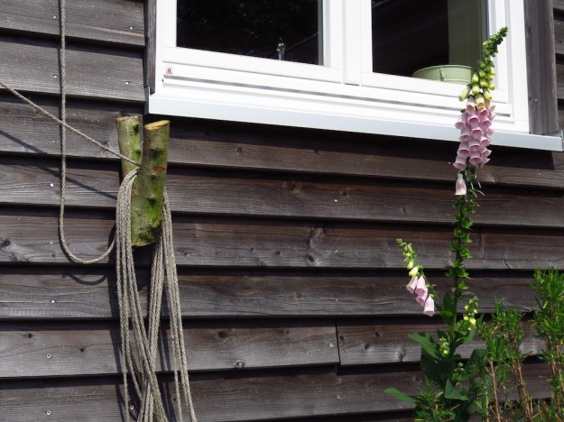 Selbst gebaut in einer 2,789-Minuten-Aktion ist auch der neue Haken für die schwedische Wäscheleine: tut ja nicht not, dass die immer so auf der Trockenmauer rumliegt, potentiell verschmutzt und meine schöne blütenweiße Wäsche kontaminiert.