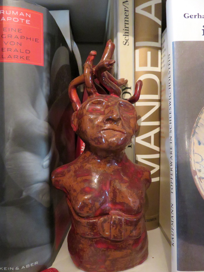 Die Sorgen wachsen wie die Schlangen auf dem Medusenhaupt und ein Gürtel schnürt die Luft zum Atmen weg: diese Figur töpferte ich in einer Zeit der Neuorientierung bzw. dem konsequenten Hinwenden zu alten Zielen.