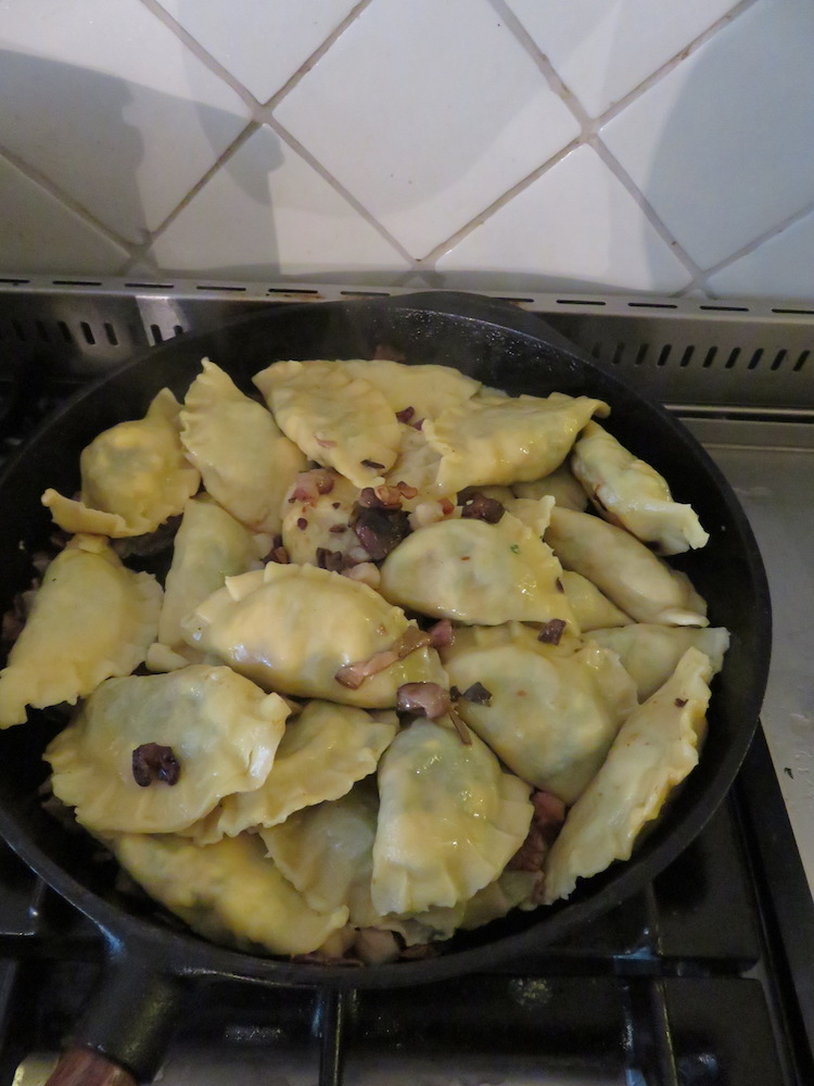 Einen großen Topf mit Salzwasser kochen und die Teigtaschen portionsweise garen. Ich habe 6-8 Stück pro Durchgang für ungefähr 4 Minuten gekocht. Mit einem Schaumlöffel entnehmen und direkt in die Pfanne mit der Speckbutter geben.