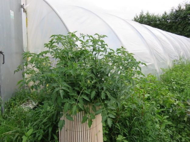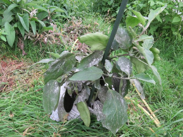 Vor dem Folientunnel stehen noch Wildtomaten auf der Nordseite sowie eine Aubergine, die ich testweise mit Kieselgur behandelt habe. Sie war über und über mit klebrigen Ausscheidungen irgendwelcher Schadinsekten überzogen und sah kläglich aus. Ich puderte sie mit Kieselgur ein weil ich dachte, was bei Hühnern gegen Milben hilft, hilft auch gegen andere Insekten und nun steht die Pflanze draussen, um ihre Blattspalten wieder freiregnen zu lassen. Scheint zu funktionieren!