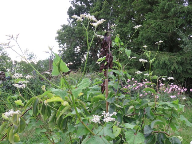 Das ‚Kräuterbeet‘ am Hühnerstall mit Zuckermais ‚Yucon Chief‘, einer Feuerbohne mit schwarzen Körnern, der Stangenbohne ‚Neckarkönigin‘, Süßkartoffel und Yacon.