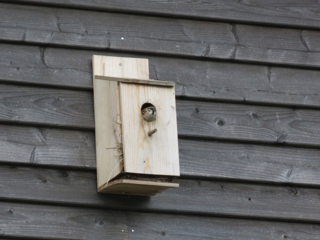 Derzeit ist unser Garten bevölkert von Spatzen. Massenhaft Spatzen, was sehr gut ist, denn selbst die Zahlen dieses früheren Massenvogels sind drastisch zurückgegangen. Spatzen laben sich an verstreuten Resten des Hühnerfutters – was ich in Hinblick auf mögliche Krankheitsübertragung sowie Auftreten von Ungeziefer nicht gut finde – und sie brüten überall, wo sich ein Nistkasten finden lässt.