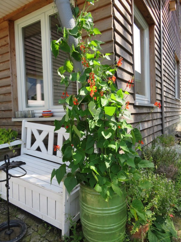 An der Regenrinne habe ich hochprofessionell und todschick ein Stück Karnickeldraht festgetüdelt, damit die steirische Käferbohne den Weg zur Sonne zur Freiheit findet. Getreu dem Motto ‚Sieht man später nicht mehr‘. Furchtbar. Den Schirmständer aka Halterung für Kaminbesteck habe ich vom Schrott ergattert und aus unerfindlichen Gründen dort geparkt.