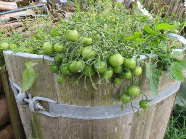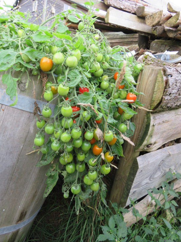 Als nächstes kommen wir an dem Saunafass vorbei, welches ich dieses Jahr mit Mist und Erde gefüllt und mit der Ampeltomate ‚Tumbling Tom‘ bepflanzt habe. Die Sorte keimte schlecht und wuchs in den ersten Wochen extrem spärlich, fast war ich geneigt, meinen raren Platz nicht mit den Kümmerlingen zu verschwenden. Dann aber legten die Pflanzen plötzlich los und mittlerweile hängen auf der Nordseite des Kübels die Tomaten in dicken Trauben.
