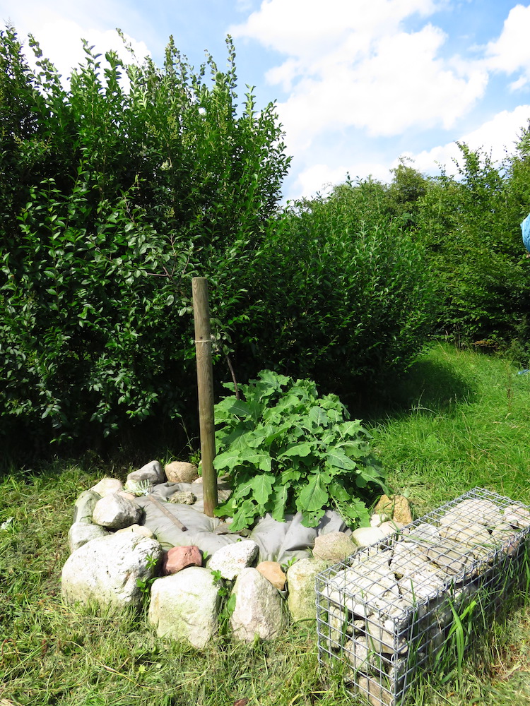 Am Weg zum Entengehege und Hundepferch ein rundes Hochbeet wie ein Friesenwall mit der Blutbirne und ewigem Kohl.
