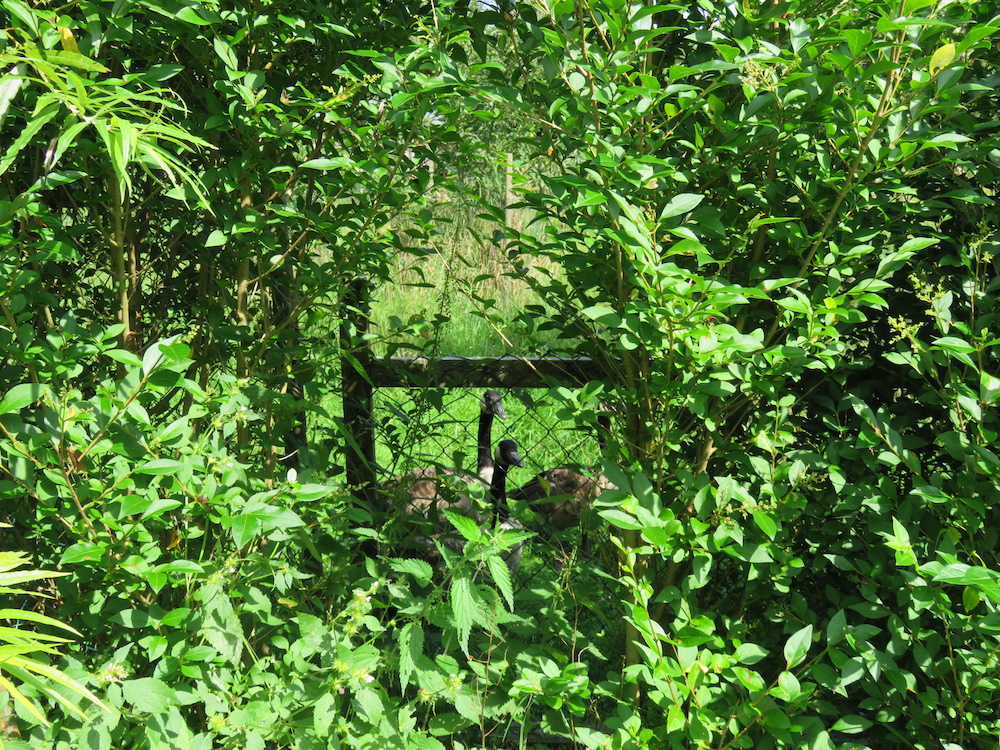 Die Ligusterhecke ist ausser Rand und Band, mittlerweile ist die untere Pforte wildromantisch zugewachsen und die Hecke bildet einen schönen Rahmen für die neugierigen Kanada-Gänse.