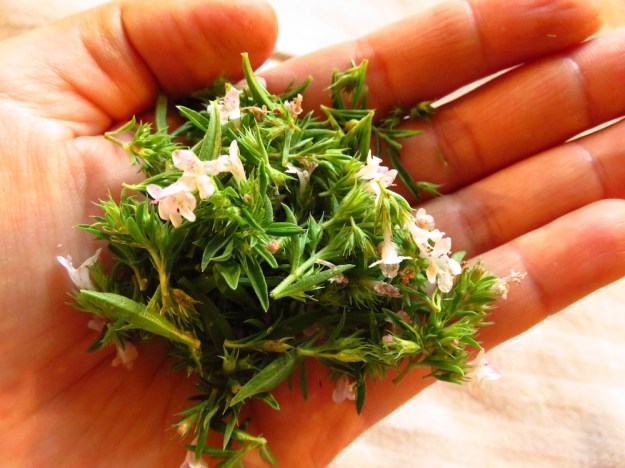 Gewürzt wird nur mit etwas Bohnenkraut (ich kultiviere dieses Jahr nur mein mehrjähriges Bergbohnenkraut Satureja montana, einjähriges funktioniert natürlich ebenfalls) und einem guten Olivenöl, der herb-aromatische Geschmack des Mangalitza ist zusätzliche Würze genug.