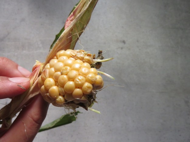 Die Befruchtung war anscheinend zum Teil nicht optimal und ausserdem treiben einzelne Maiskörner direkt am Kolben schon wieder aus.