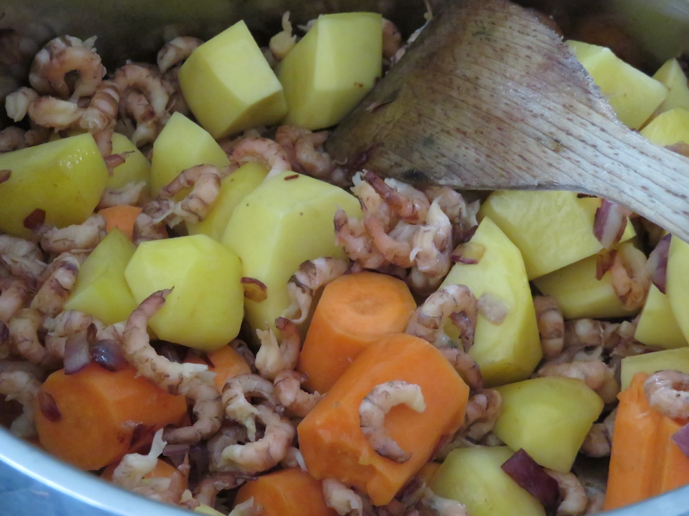 Kartoffeln, Karotten und etwa 250g der Krabben in etwas Öl kurz und sanft anbraten, dann mit dem Tomatensaft angiessen. Wasser und Suppenpulver zugeben und gar kochen.
