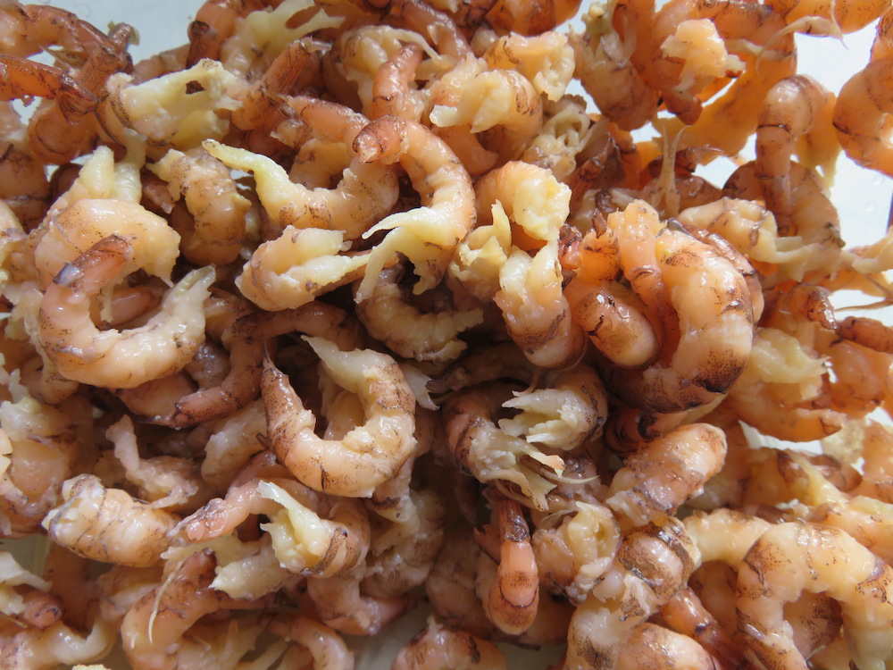 Die fertig gepuhlten Krabben haben übrigens – auch wenn sie hier vor Ort an der Nordsee verkauft werden – meist eine weite und wochenlange Reise hinter sich weil der Großteil kostengünstig in Marokko gepuhlt wird. Mal abgesehen von Lohnsklaverei und Transportirrsinn gibt es an diesem Aspekt noch andere Punkte, die für mich den Kauf von ungepuhlten Krabben ausschliessen. Und da ich bezweifle, dass man heute so einfach seine Krabbenversorgung am Priel sicherstellen kann, schlug ich also kürzlich beim Kilopreis von 9,99€ zu.