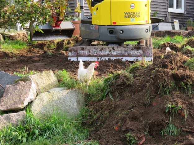 Diesen hatten wir im Oktober auf dem Hof, um den Bauplatz zu planieren, die Wege zu ebnen und das große mit Fundamentsteine eingefasste Hochbeet (aus dem letzten Winter … herrje) zu nivellieren.